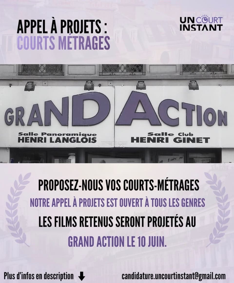 Le festival Un Court Instant lance son appel à courts métrages pour sa 3e édition, qui se tiendra le mercredi 10 juin à 19h au Grand Action (Paris). Tous les genres sont acceptés (fiction, documentaire, animation, expérimental…) pour des films de 2 à 12 minutes. Les réalisateurs sélectionnés recevront deux places pour la soirée et l’accès au buffet d’après-projection.Pour candidater, envoyez un lien privé de votre film, une courte fiche technique et votre numéro de téléphone à : candidature.uncourtinstant@gmail.com