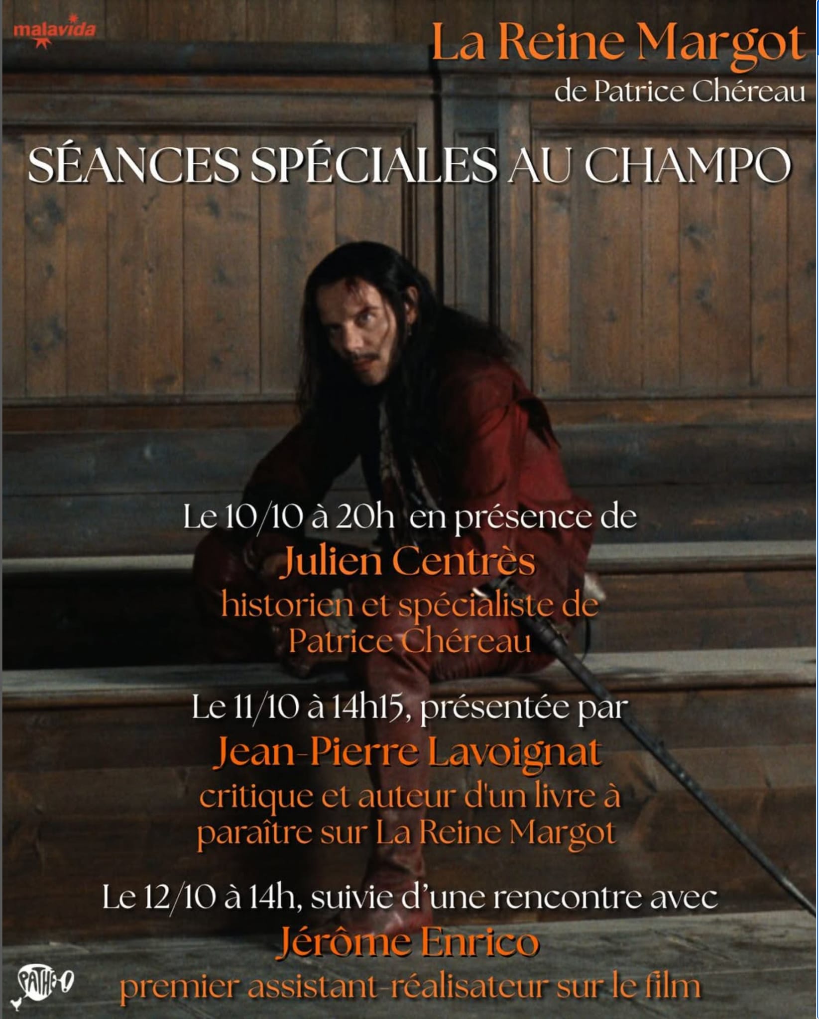 A Paris, le Champo organise des séances spéciales: Vendredi 10 octobre à 20h Julien Centrès, docteur en Histoire et directeur de l’édition du Journal de travail de Patrice Chéreau chez Actes Sud-Papiers, viendra expliquer le travail du réalisateur. Samedi 11 octobre à 14h15, le critique de cinéma, ancien directeur de la rédaction de Studio Magazine, Jean-Pierre Lavoignat nous éclairera sur le tournage. Dimanche 12 octobre à 14h, Jérôme Enrico, à l’époque premier assistant réalisateur de Chéreau, partagera son expérience sur le film.